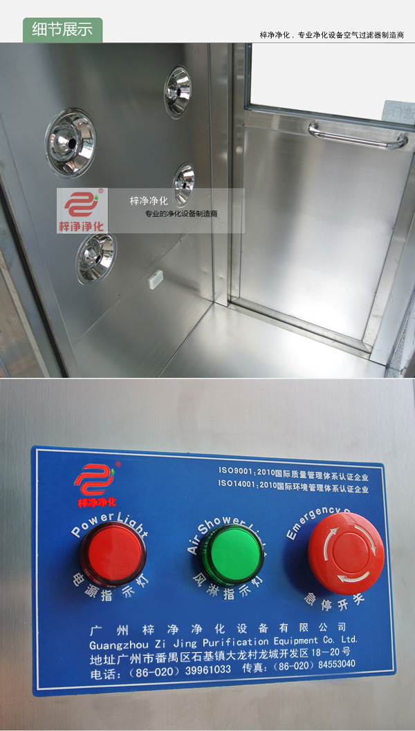 工作原理:用于人員出入,防止不潔凈氣流進入潔凈區,工作區內設置吹淋凈化處理裝置,消除人、物表面附著塵埃,同時具有氣閘作用,配合潔凈空調系統確保潔凈室達到所需潔凈度。