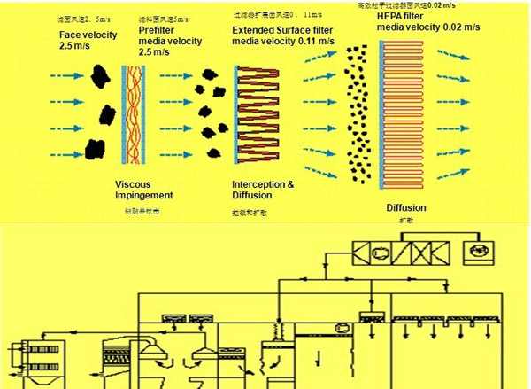 空調(diào)送風系統(tǒng)通過一定的流速將灰塵送到過濾系統(tǒng)當中,初級過濾器將5um以上大顆?;覊m留在過濾表 面,中效過濾器將1um-5um顆粒抓取,高效過濾器將0.3um-0.5um以上灰塵顆粒過濾,從而保證無塵車間等級!