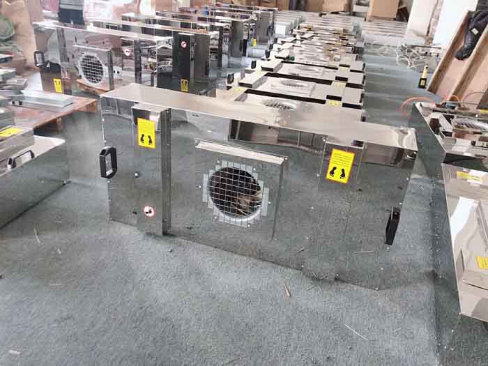 FFU風機過濾器之層流罩:層流罩是將空氣經風機以一定的風壓通過高效空氣過濾器后,由阻尼層均壓,使潔凈空氣呈垂直層流型氣流送入工作區,從而保證了工作區達到工藝所需的高潔凈度。