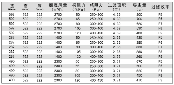 用戶選購指南-箱式中效過濾器技術參數