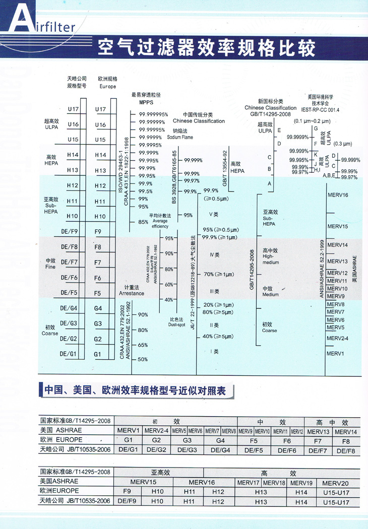 國內外最新空氣過濾器效率規格表: 國內外最新空氣過濾器效率規格表包括國標,美標,歐標三種國際標準
